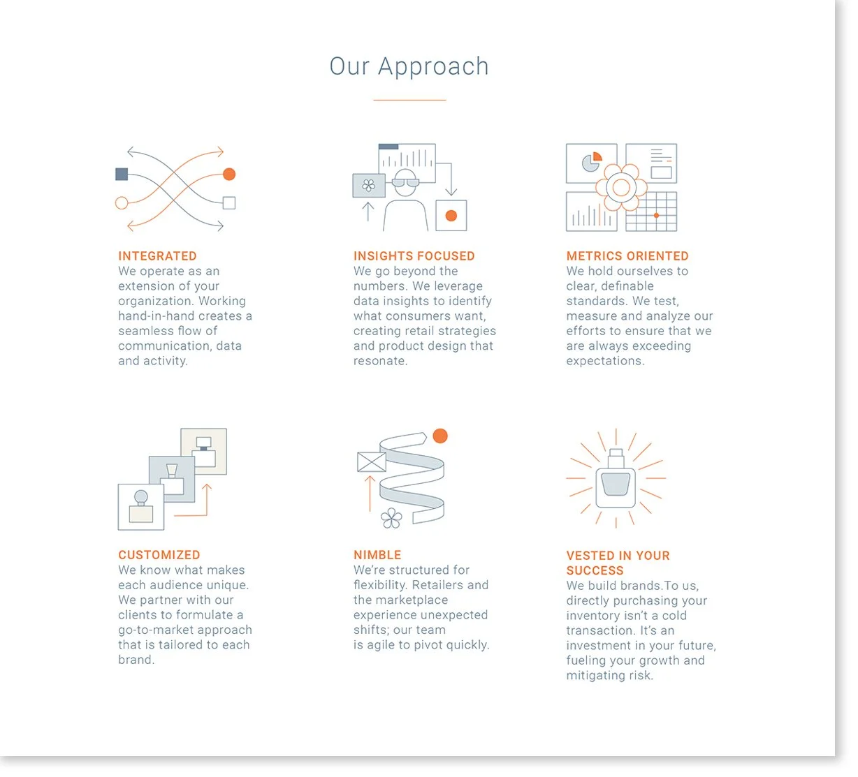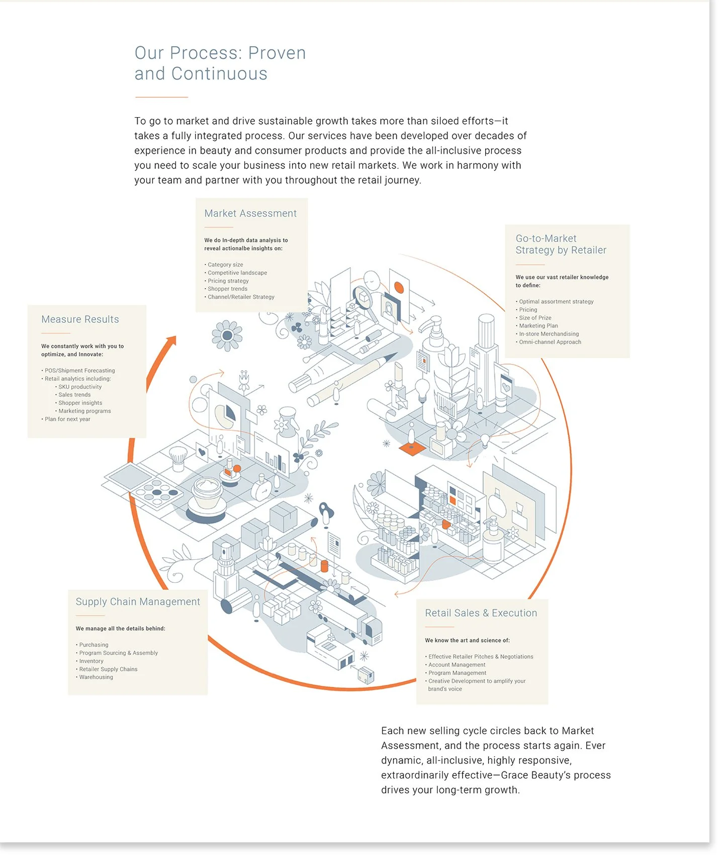 Grace Beauty has been a leader in the beauty products distribution and brand development business for decades. Recently they have also developed a successful venture capital division which invests in early-stage consumer brands (Peloton, Warby Parker etc). The challenge with this site was to bring the two parts of the business together under one umbrella and show how the strengths of one division inform the other. Daniel Spacek’s technical and whimsical illustrations map key processes while simultaneously embodying the genuine warmth and energy of this family business.